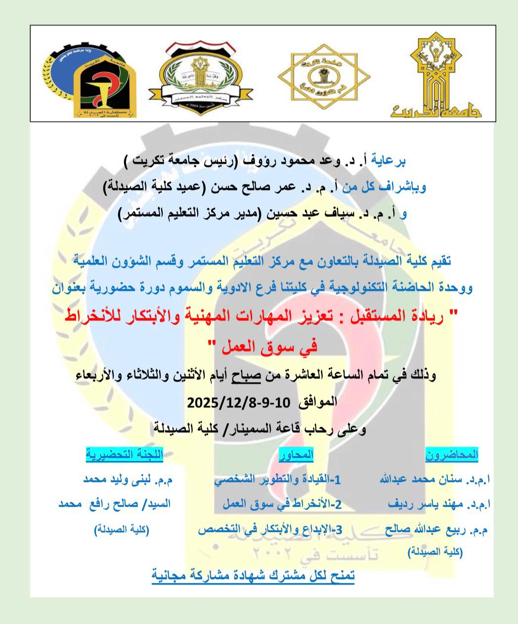 انطلقت صباح اليوم الاثنين الموافق 2025/12/8 في كلية الصيدلة – جامعة تكريت، أعمال الدورة التدريبية...
