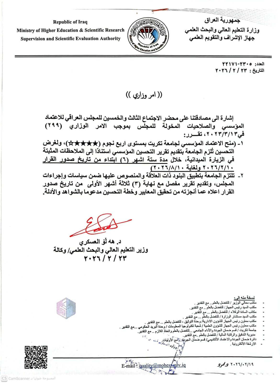 في إنجازٍ نوعي يُعد الابرز في محطات مسيرتها الأكاديمية، جامعة تكريت تحصل رسمياً على الاعتماد المؤسسي الوطني لجميع كلياتها ، بعد استيفائها معايير الجودة الوطنية المعتمدة من جهاز الإشراف والتقويم العلمي بوزارة التعليم العالي والبحث العلمي لتُمنح أربع نجوم من أصل خمس نجوم مما يعدتصنيفامتقدما ومتفردا بين الجامعات العراقية الحكومية والاهليةالتي دخلت هذا المضمار العلمي ، وقد منحت الجامعة مهلة ستة أشهر فقط وهو مؤشر نوعي آخر نالته الجامعة دون غيرها لاستكمال الملاحظات البسيطة التي اشرت من قبل الفريق الوطني الذي زار الجامعة في وقت سابق. وعلى الفور باشرت الجامعة بتوجيه لجانها واستنفارها مرة اخرى لوضع الحلول اللازمة لمعالجة تلك الملاحظات.