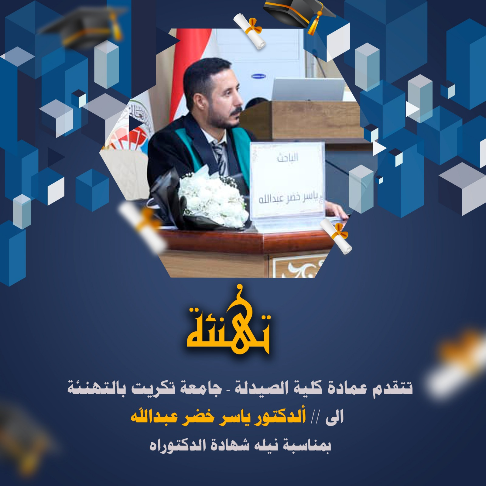 تتقدم عمادة كلية الصيدلة – جامعة تكريت، بأحر التهاني وأطيب التبريكات إلى التدريسي في كليتنا الدكتور (ياسر خضر عبدالله محمد) بمناسبة حصوله على شهادة الدكتوراه في اختصاص فسلجة دم وتناسل من كلية الزراعة قسم الانتاج الحيواني – جامعة تكريت، عن أطروحتة الموسومة: