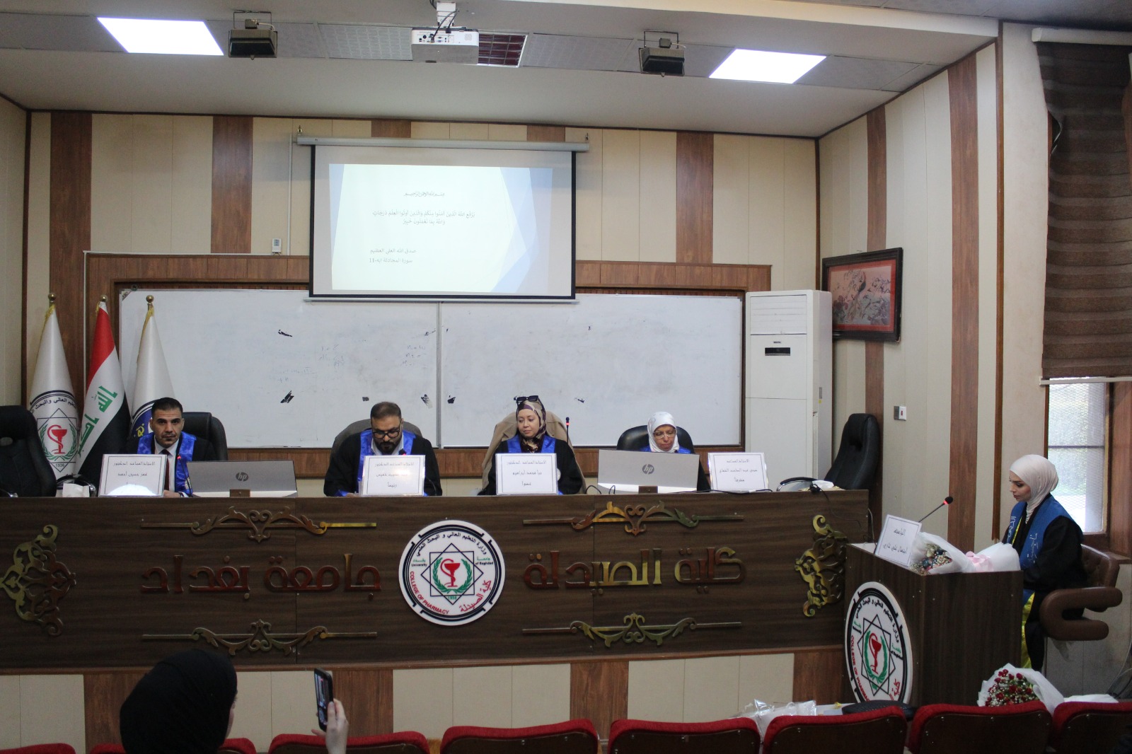 وقد أجريت المناقشة في تمام الساعة التاسعة من صباح يوم الاثنين الموافق 2026/2/23، على قاعة الرازي في كلية الصيدلة جامعة بغداد.