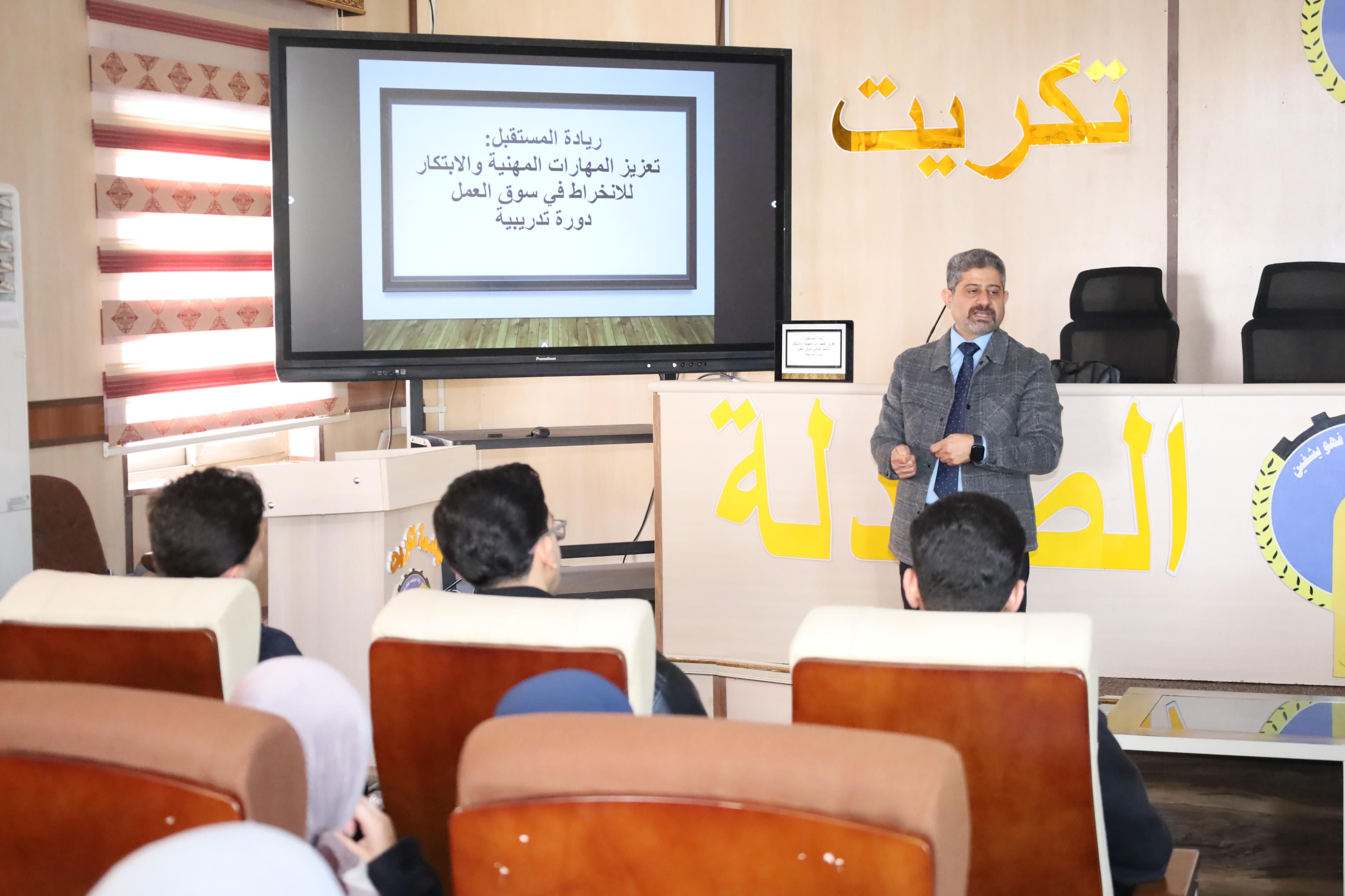 واستهل اليوم الأول بمحاضرة قدمها الاستاذ المساعد الدكتور سنان محمد عبدالله، تناول فيها مفهوم القيادة، وصفات القائد، والتطوير الشخصي في ريادة المستقبل والأعمال والابتكار، بوصفها مرتكزات أساسية للانخراط في سوق العمل.