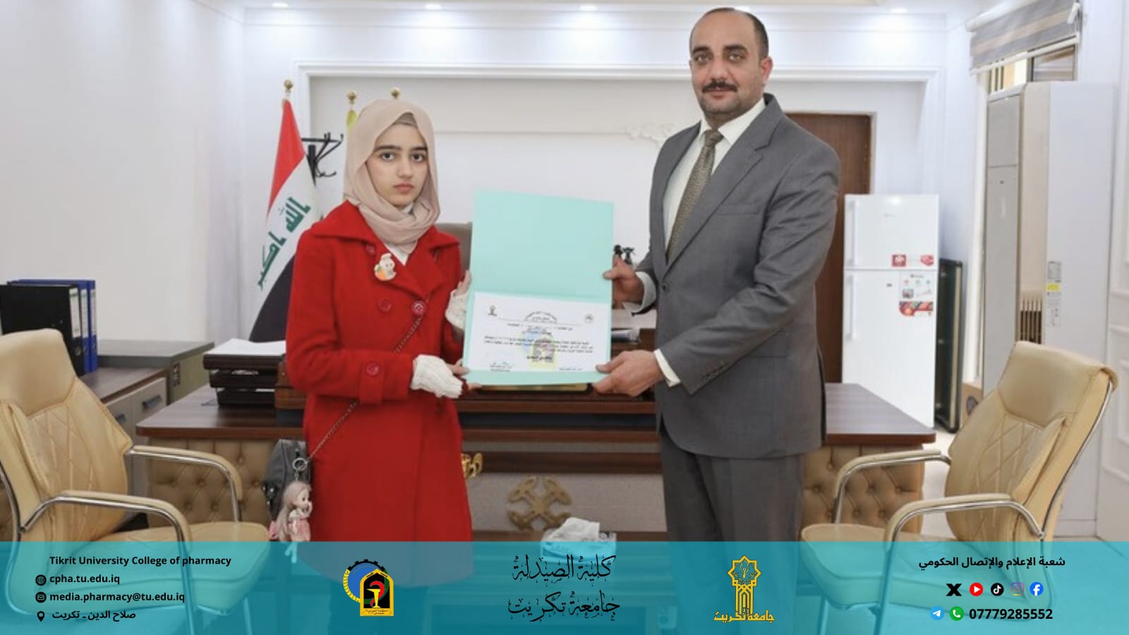 برعاية الأستاذ الدكتور وعد محمود رؤوف رئيس جامعة تكريت المحترم، كرم السيد عميد كلية الصيدلة الأستاذ المساعد الدكتور عمر صالح حسن الطالبة نرمين محمود شهاب من المرحلة الثانية، تقديراً لمشاركتها المتميزة في بطولة الجامعة للشطرنج وتميزها بحصولها على المركز الأول.