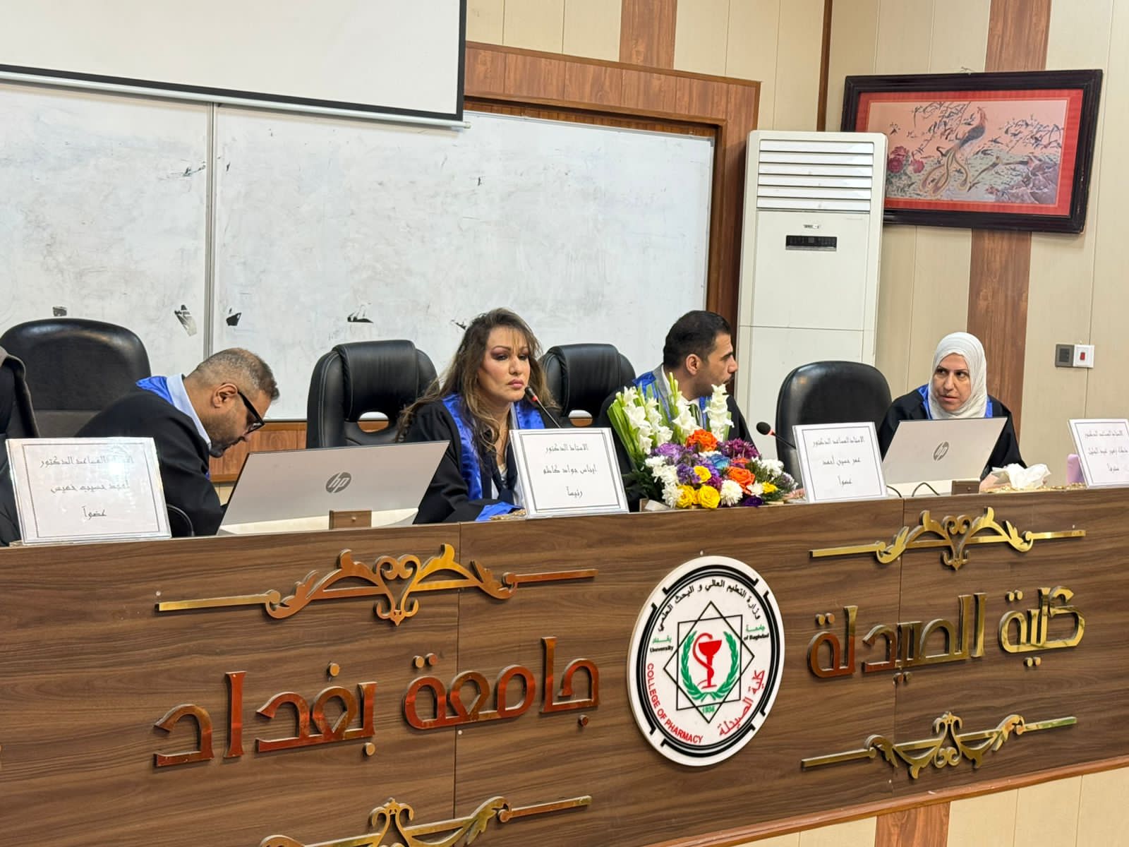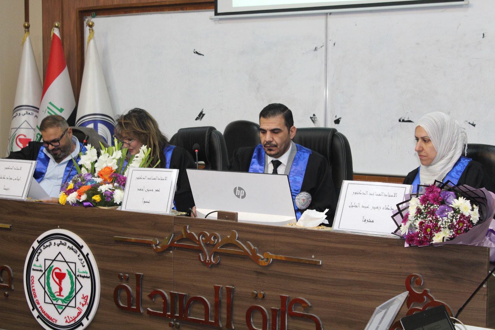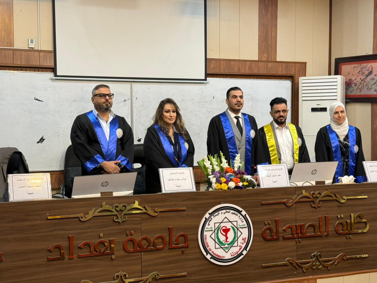 وقد أجريت المناقشة في تمام الساعة التاسعة من صباح يوم الخميس الموافق 2026/3/12، على قاعة الرازي في كلية الصيدلة جامعة بغداد.