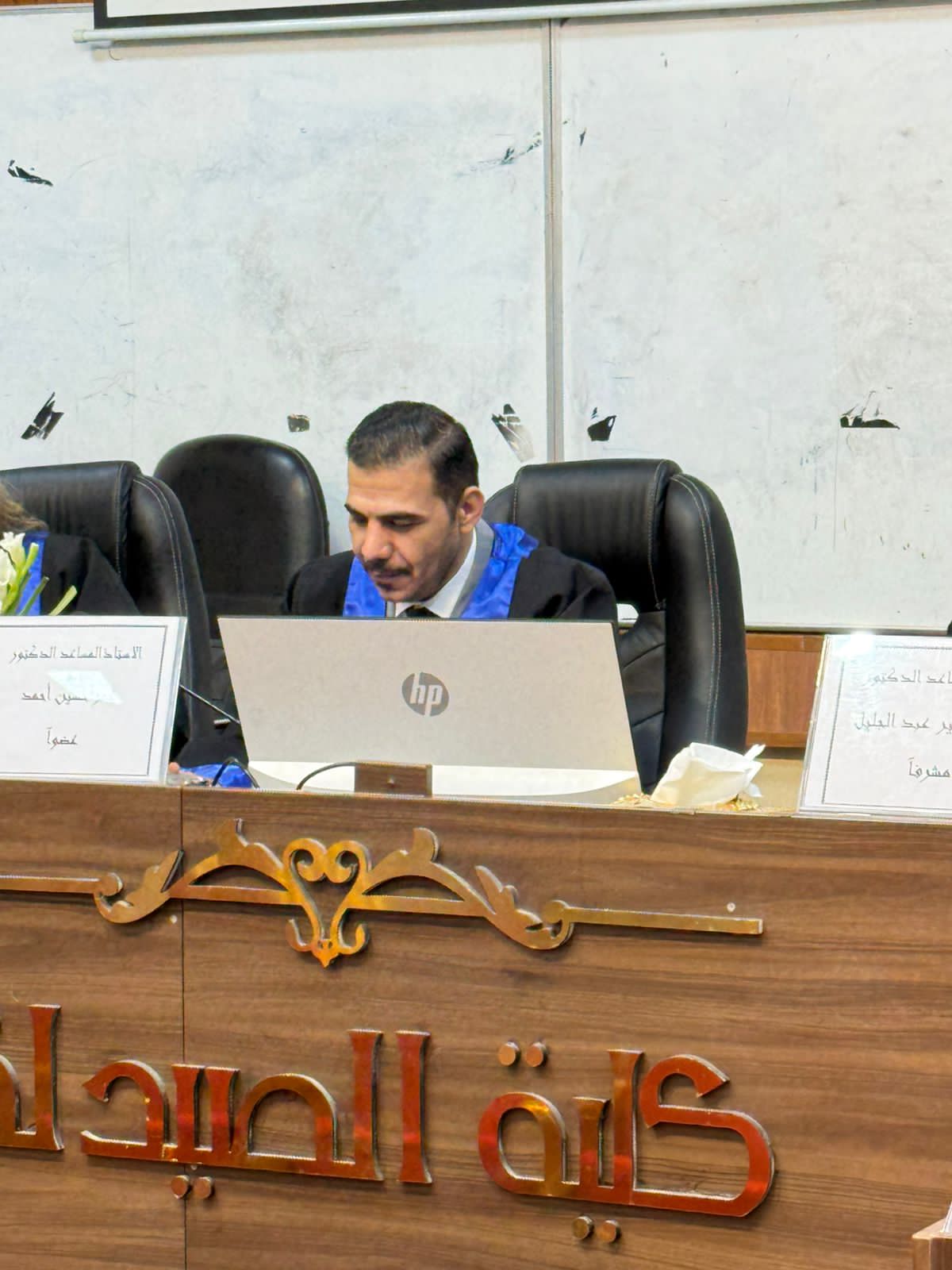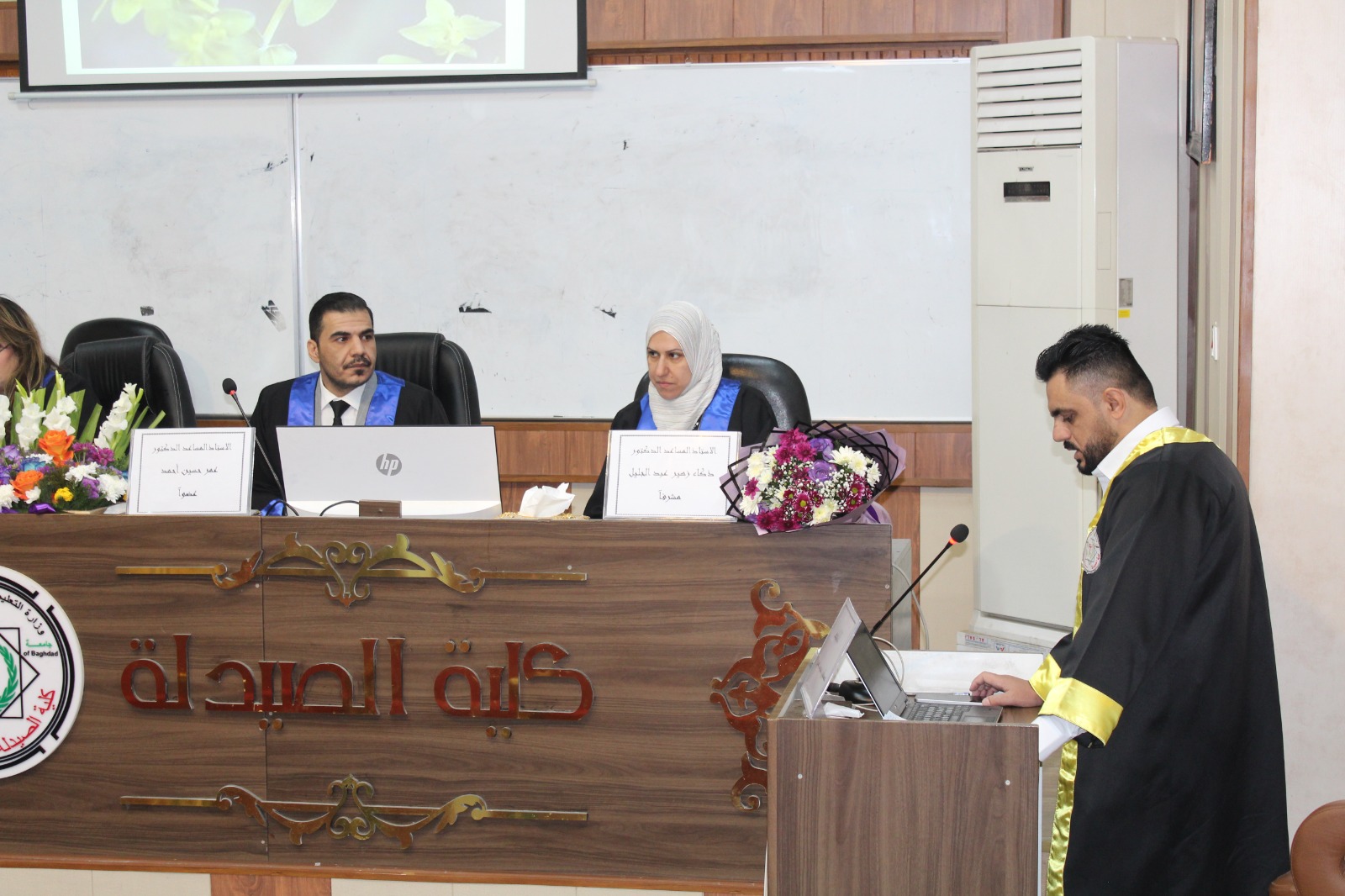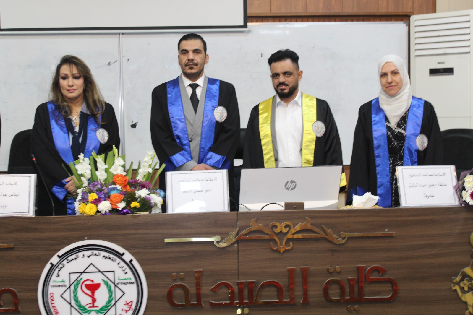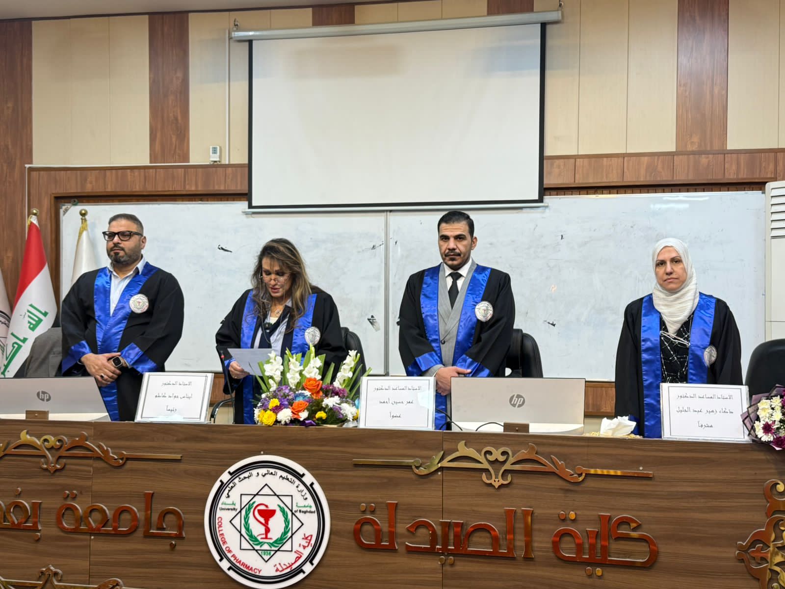 وقد أجريت المناقشة في تمام الساعة التاسعة من صباح يوم الخميس الموافق 2026/3/12، على قاعة الرازي في كلية الصيدلة جامعة بغداد.