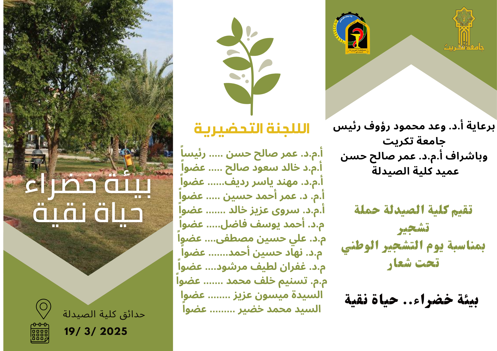 ايماناً منها بأهمية التشجير وزيادة المساحة الخضراء ؛ تقيم كلية الصيدلة بجامعة تكريت فعالبات يوم التشجير بالتزامن مع اليوم الوطني للتشجير وتنفيذاً لتوصيات وزارة التعليم العالي والبحث العلمي ؛ حيث تعد هذه الحملة خطوة بالغة الأهمية في ترسيخ ثقافة الاستدامة البيئية والمسؤولية المجتمعية. إذ لا يقتصر دور المؤسسات الأكاديمية على نشر العلم فحسب، بل يمتد ليشمل غرس القيم البيئية وتعزيز الوعي بأهمية التشجير في تحسين جودة الهواء، وتقليل التلوث، ومكافحة التصحر.