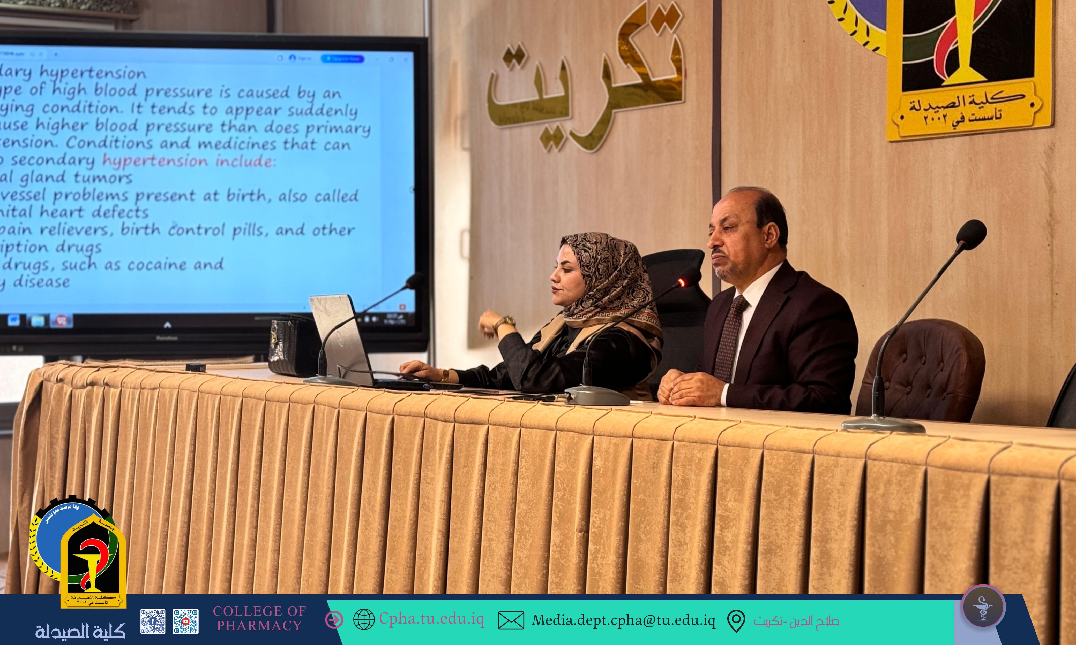 قدم الدكتور جواد علي القيسي والمدرس المساعد رابعة خالد عبد السلام اليوم ندوة حول مرض ارتفاع ضغط الدم في قاعة السيمنار بكلية الصيدلة
