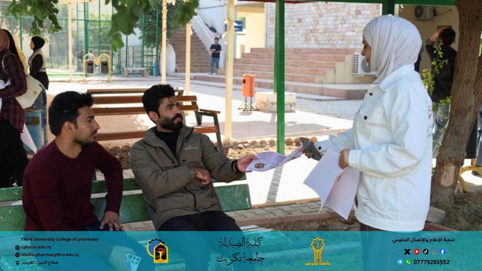 بناءً على توجيهات وزارة التعليم العالي والبحث العلمي، وضمن إشراف الأستاذ الدكتور وعد محمود رؤوف رئيس جامعة تكريت المحترم على حملات الأسبوع العراقي لمكافحة المخدرات، وبمتابعة مباشرة من عميد كلية الصيدلة الأستاذ المساعد الدكتور عمر صالح حسن، نظمت كلية الصيدلة حملة توعوية وإرشادية حول مخاطر المخدرات وآثارها الصحية والاجتماعية.