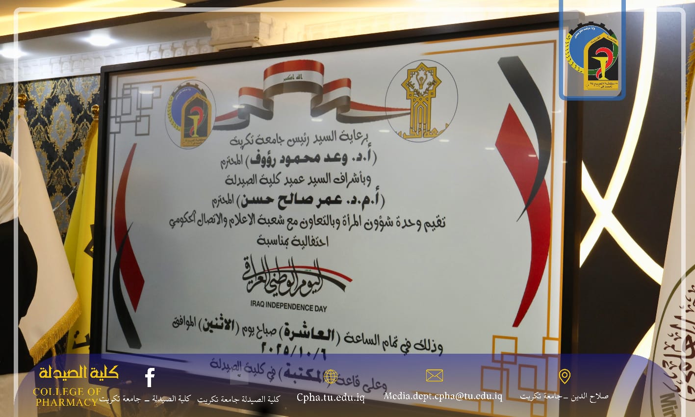 أقامت وحدة شؤون المرأة بالتعاون مع شعبة الإعلام والاتصال الحكومي في كلية الصيدلة – جامعة تكريت، صباح اليوم الاثنين الموافق 6 / 10 / 2025، احتفالية بمناسبة اليوم الوطني العراقي على قاعة المكتبة في الكلية.