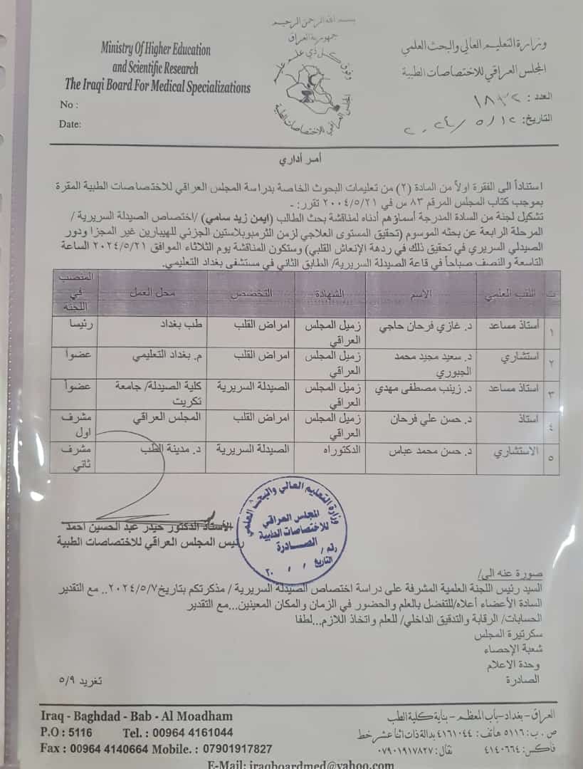 شاركت الاستاذ المساعد الدكتورة زينب مصطفى مهدي (فرع الصيدلة السريرية) بمناقشات الدراسات العليا لطلبة المرحلة الاخيرة/ بورد الصيدلة السريرية (المعادل للدكتوراه) ، والتي أقيمت بمستشفي بغداد التعليمي في مدينة الطب، وبهذا تعد الدكتورة زينب أول صيدلانية (بلقب زميل المجلس العراقي للاختصاصات الطبية ) تشارك بامتحان ومناقشات طلبة البورد في تاريخ المجلس العراقي للاختصاصات الطبية. علماً ان الدكتورة زينب شاركت بمناقشتين خلال اسبوع واحد الاولى لبحث بعنوان (تحقيق المستوى العلاجي لزمن الثرمبوبلاستين الجزئي للهيبارين غير المجزأىودور الصيدلي السريري في تحقيق ذلك في ردهة الانعاش القلبي) والثانية لبحث بعنوان (دور مقيمي بورد الصيدلة السريرية في تقليل المشاكل المتعلقة بالأدوية في مجمع مدينة الطب).