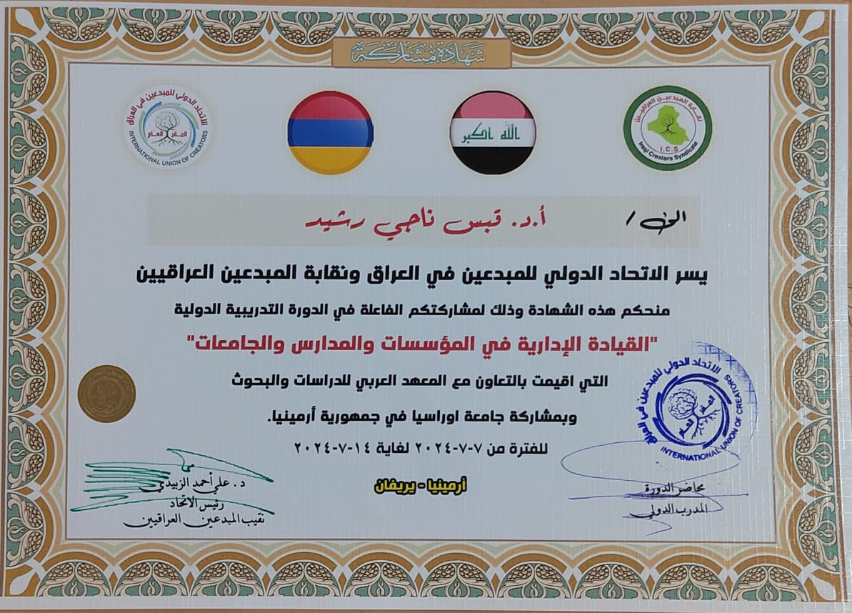 شاركت الأستاذ الدكتورة (قبس ناجي رشيد) / فرع الكيمياء الصيدلانية ، في الدورة التدريبية الدولية التي اقامها الاتحاد الدولي للمبدعين في العراق (القيادة الإدارية في المؤسسات والمدارس والجامعات) في جمهورية ارمينيا بالعاصمة يريفان للفترة من ٦-٧-٢٠٢٤ لغاية ١٣-٧-٢٠٢٤ وبحضور نوعي من اساتذة الجامعات وموظفين الدولة والقطاع الخاص، وحصلت على شهادة تقديرية للمشاركة وكذلك تم تكريمها من قبل رئيس الاتحاد الدولي للمبدعين في العراق بوسام الإبداع وكتاب شكر وتقدير.
