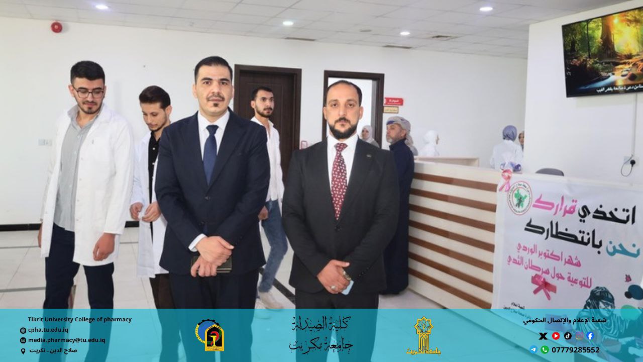 زار وفد من كلية الصيدلة بجامعة تكريت المركز التخصصي للأورام التابع لدائرة صحة صلاح الدين، برئاسة الأستاذ المساعد الدكتور عمر حسين أحمد – معاون العميد للشؤون العلمية، وبمشاركة نخبة من أعضاء الهيئة التدريسية والموظفين ومجموعة من طلبة الكلية.