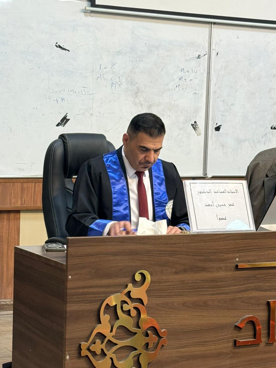 شارك الأستاذ المساعد الدكتور عمر حسين أحمد، معاون العميد للشؤون العلمية بكلية الصيدلة – جامعة تكريت، في عضوية لجنة مناقشة رسالة الماجستير الموسومة: