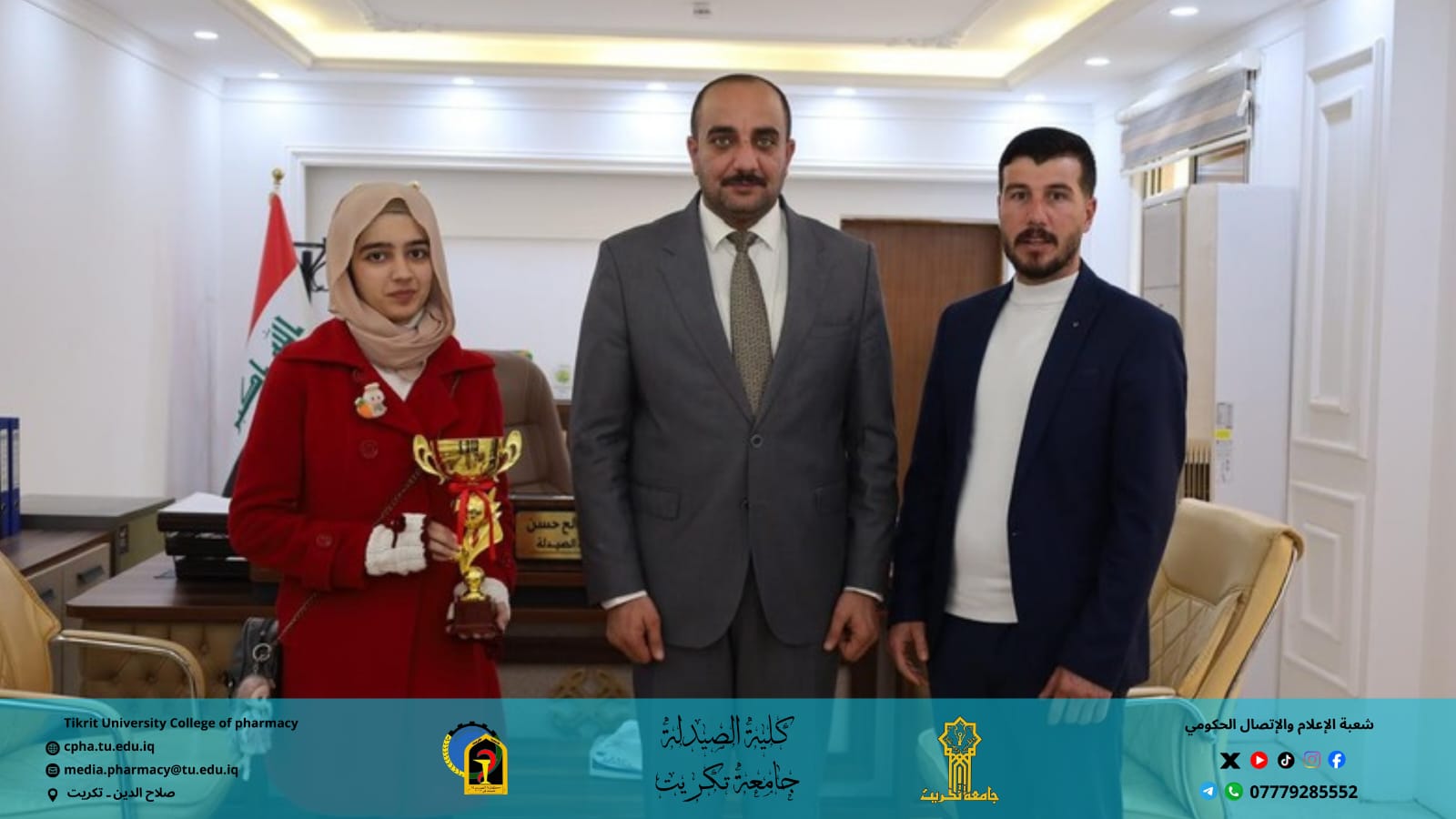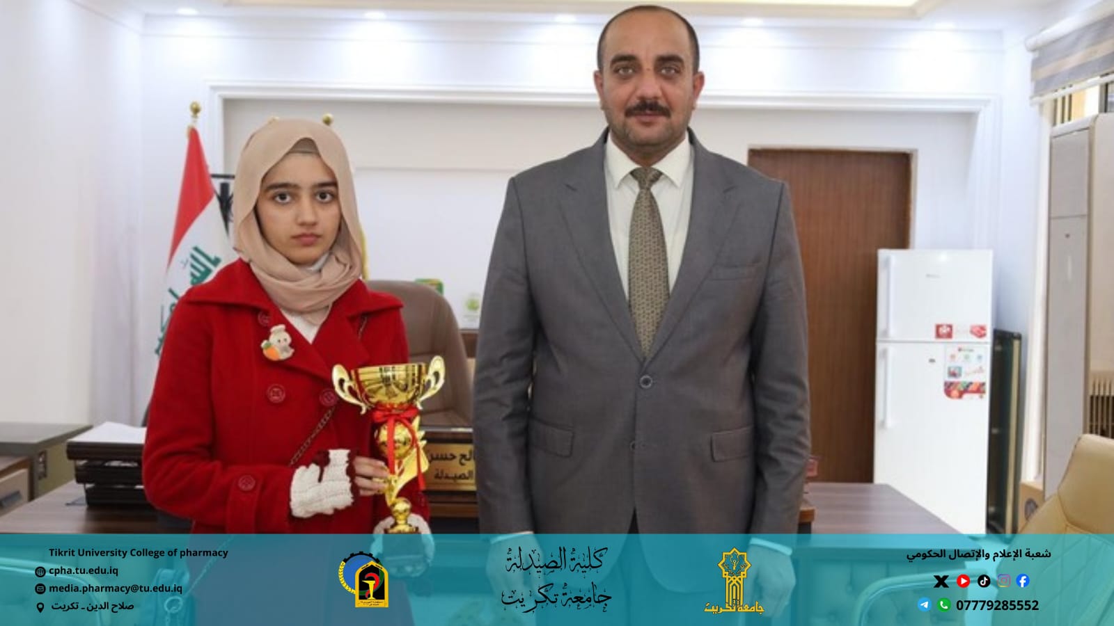 برعاية الأستاذ الدكتور وعد محمود رؤوف رئيس جامعة تكريت المحترم، كرم السيد عميد كلية الصيدلة الأستاذ المساعد الدكتور عمر صالح حسن الطالبة نرمين محمود شهاب من المرحلة الثانية، تقديراً لمشاركتها المتميزة في بطولة الجامعة للشطرنج وتميزها بحصولها على المركز الأول.