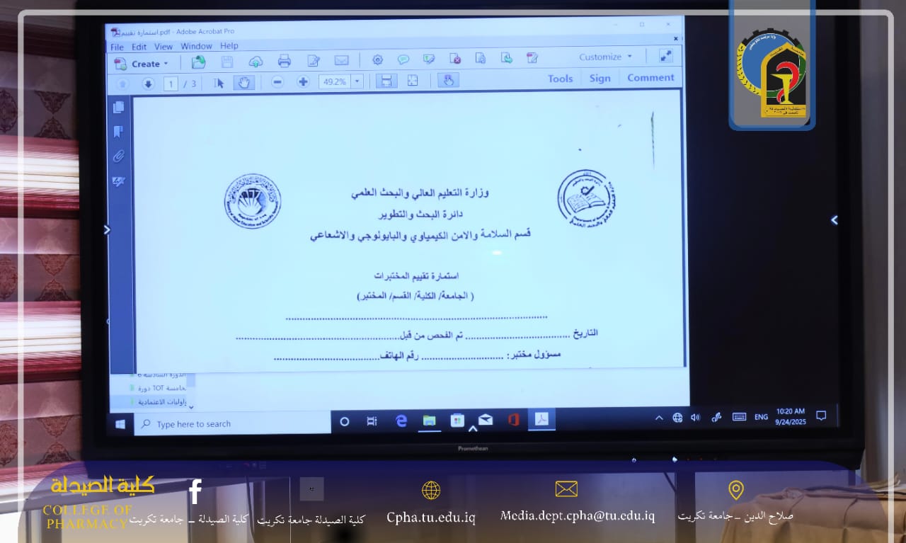 اختتمت في كلية الصيدلة – جامعة تكريت، يوم الأربعاء الموافق 24/9/2025، أعمال الدورة الحضورية الموسومة "إجراءات السلامة والأمن الكيميائي في المختبرات الجامعية"، التي نظمتها شعبة السلامة والأمن الكيميائي والبايولوجي والإشعاعي في رئاسة الجامعة، بالتعاون مع عمادة كلية الصيدلة ومركز التعليم المستمر، وبرعاية السيد رئيس الجامعة الأستاذ الدكتور وعد محمود رؤوف، وإشراف عميد كلية الصيدلة الأستاذ المساعد الدكتور عمر صالح حسن.