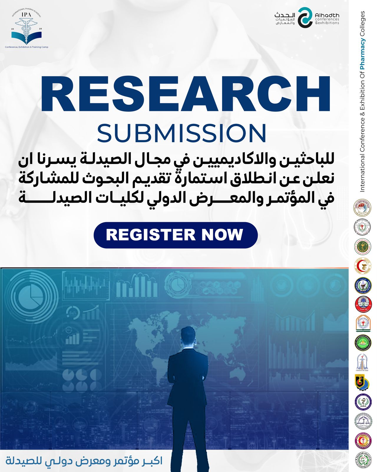 يسرنا أن نعلن عن انطلاق استمارة تقديم البحوث للمشاركة في المؤتمر والمعرض الدولي الأول للصيدلة ، الذي سيُقام برعاية لجنة عمداء كليات الصيدلة في العراق.