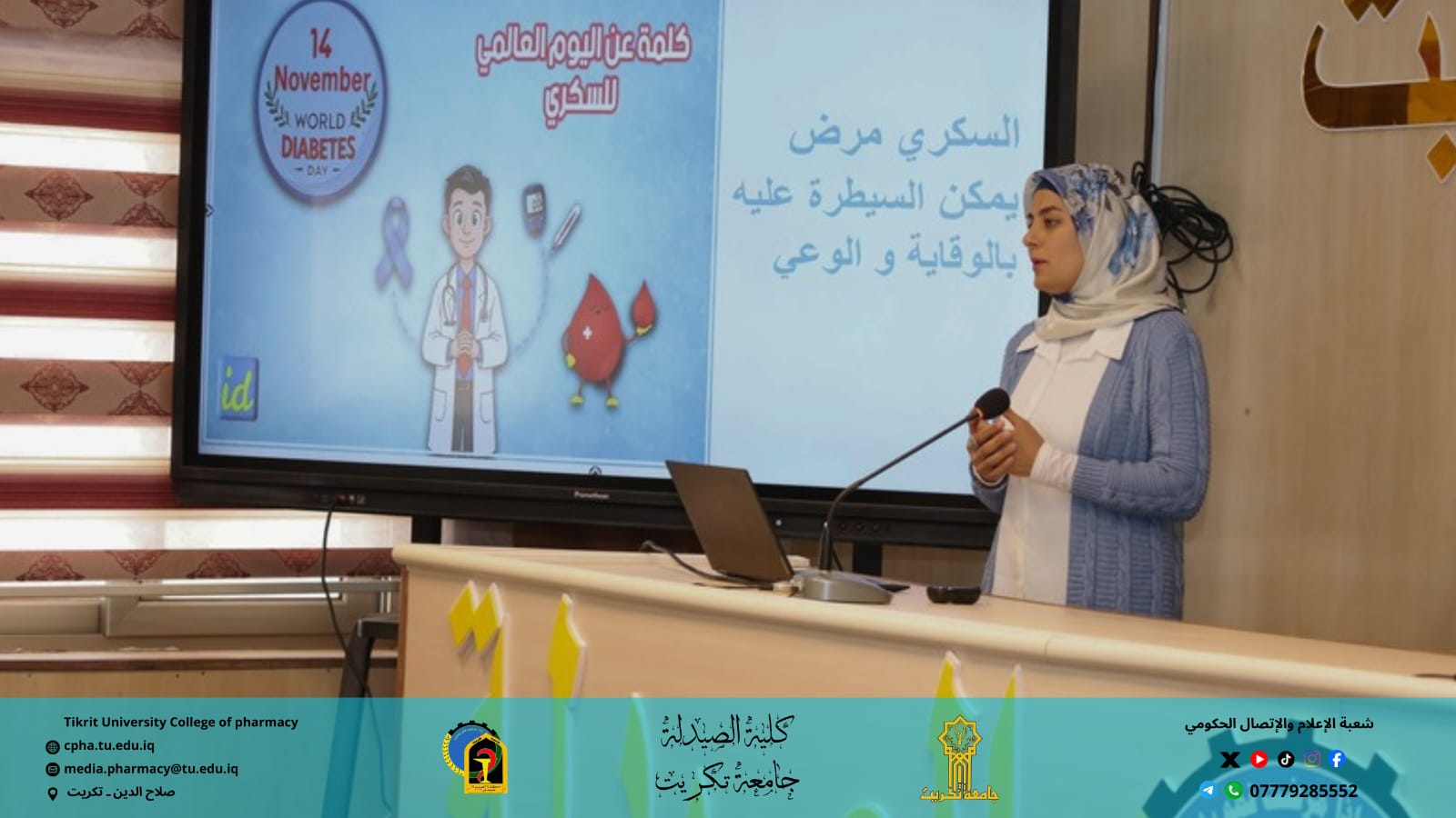 نظمت كلية الصيدلة بالتعاون مع مركز التعليم المستمر وقسم الشؤون العلمية ندوة علمية توعوية حضورية بعنوان: "اليوم العالمي لمرض السكري"، وذلك يوم الأحد الموافق 23 / 11 / 2025 على قاعة السمنر في كلية الصيدلة.