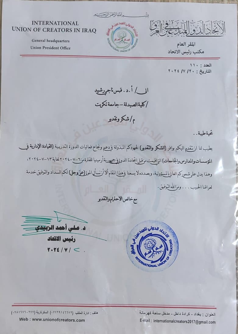 شاركت الأستاذ الدكتورة (قبس ناجي رشيد) / فرع الكيمياء الصيدلانية ، في الدورة التدريبية الدولية التي اقامها الاتحاد الدولي للمبدعين في العراق (القيادة الإدارية في المؤسسات والمدارس والجامعات) في جمهورية ارمينيا بالعاصمة يريفان للفترة من ٦-٧-٢٠٢٤ لغاية ١٣-٧-٢٠٢٤ وبحضور نوعي من اساتذة الجامعات وموظفين الدولة والقطاع الخاص، وحصلت على شهادة تقديرية للمشاركة وكذلك تم تكريمها من قبل رئيس الاتحاد الدولي للمبدعين في العراق بوسام الإبداع وكتاب شكر وتقدير.