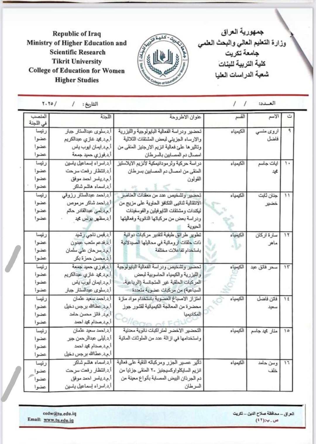 في إطار التعاون العلمي والأكاديمي بين الكليات والتخصصات المتماثلة، شارك كل من الأستاذ المساعد الدكتور ياسر أحمد موفق سليمان والأستاذ الدكتورة قبس ناجي رشيد، التدريسيين في كلية الصيدلة – جامعة تكريت، في أعمال الامتحان الشامل لطلبة الدكتوراه في قسم الكيمياء بكلية التربية للبنات – جامعة تكريت، وذلك يوم الأربعاء الموافق 1 / 10 / 2025.